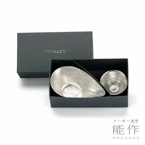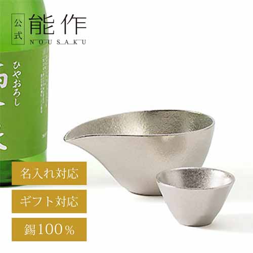 片口と盃の酒器セット。富山県高岡の伝統技術を活かした職人仕上げで、錫は抗菌性が高く、飲み口のやわらかさが特徴的。一つひとつ職人が手作業で仕上げていて、名入れサービスにも対応しています。