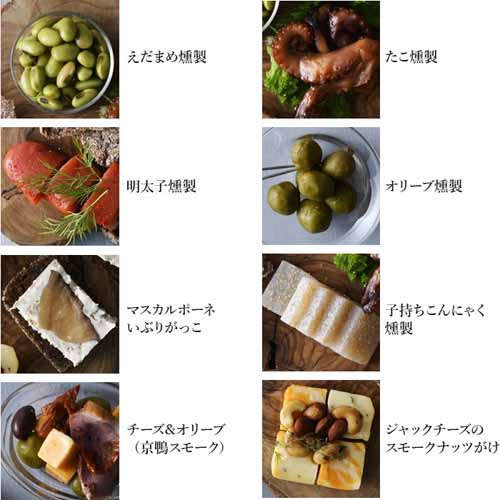 桜チップで燻した枝豆やタコ、プチプチ食感が楽しいししゃも入りこんにゃくなど、8種類の燻製が入った豪華セット。素材の旨味をそのまま活かしたラインナップで、それぞれ真空パックで個包装されていて便利です。