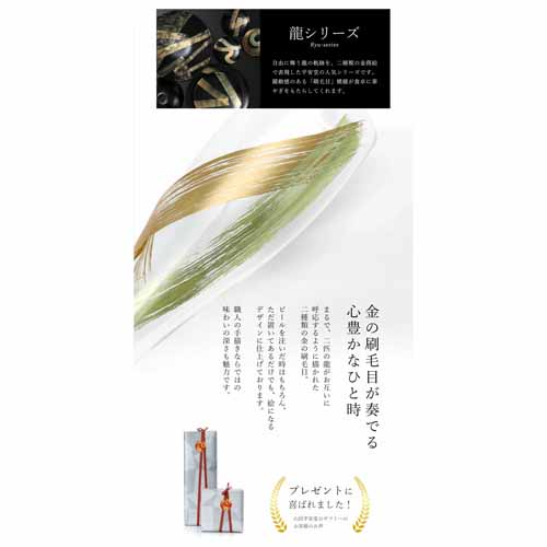 日本の伝統工芸である「蒔絵」の技法で金の刷毛目を描いたビアグラス。二匹の龍が互いに呼応するように描かれた芸術的なデザインで、存在感がずば抜けたアイテムです。