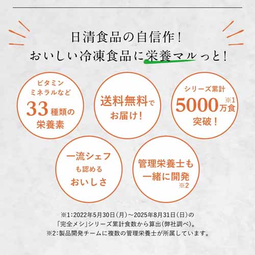 管理栄養士とともに開発した日清食品の自信作。33種類の栄養素と美味しさのバランスを追求した「完全メシ」の冷凍シリーズです。三大栄養素だけでなく、ビタミン・ミネラル・必須脂肪酸もバランス良く整えられています。