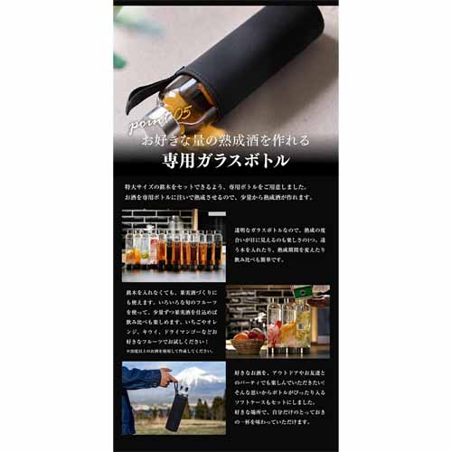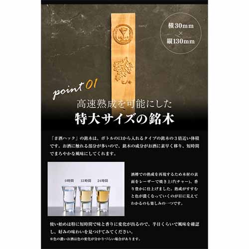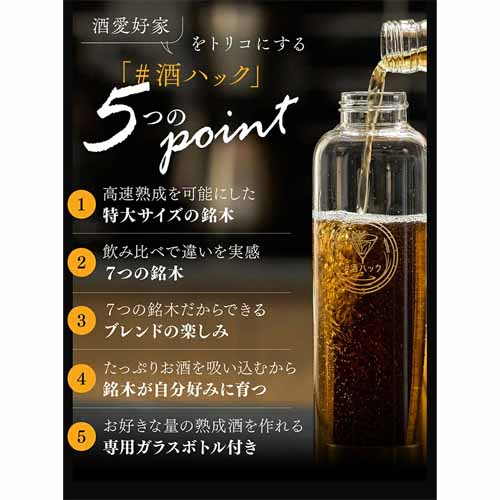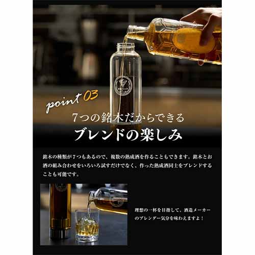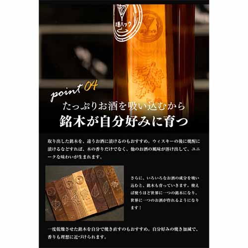 銘木をセットしたガラスボトルにお酒を注げば、半日待つだけで、いつものお酒が樽で熟成したようなまろやかさと豊かな香りに仕上がります。ミズナラ・バーチ・栗・桜など、それぞれ味と香りが異なる7種類の銘木。見た目もおしゃれで、SNS映えも抜群です。