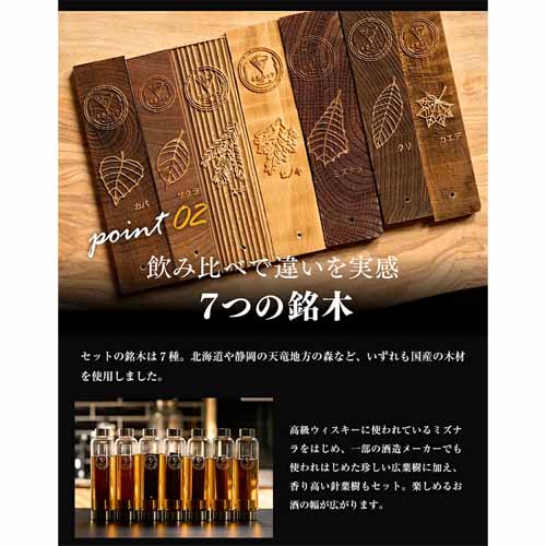 7種類の銘木がセットになっていることがポイント。飲み比べを楽しんだり、ブレンドすることで理想の一杯を目指すこともできます。
