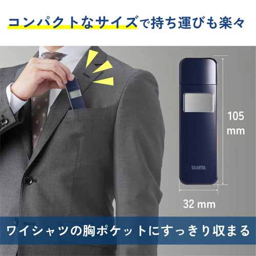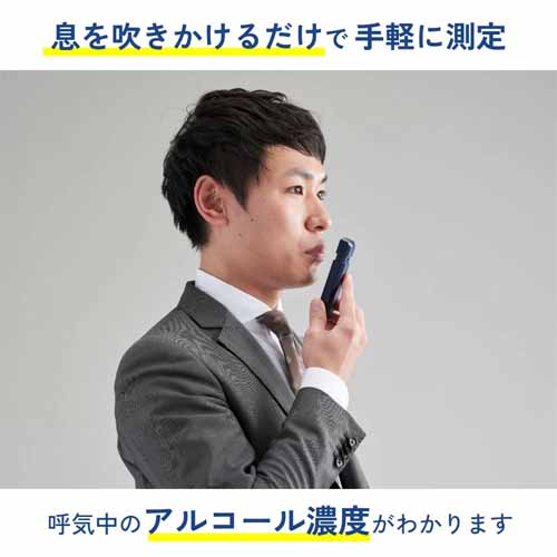 息を吹きかけるだけで、手軽に呼気中のアルコール濃度がチェックできます。ワンタッチ操作で測定でき、ワイシャツの胸ポケットにもすっきり収まるコンパクト&軽量デザイン。アルコール検知器協議会(J-BAC)認定機器です。