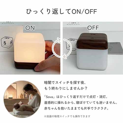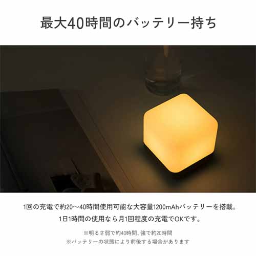 1回の充電で最大40時間使用可能な大容量バッテリーを搭載し、コードレスで持ち運び自由。2段階調光の電球色LEDが採用され、本体をひっくり返すだけでON/OFFが切り替わるユニークな設計です。タイマー機能付きなので就寝前にも使えます。