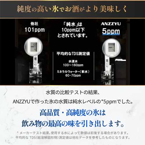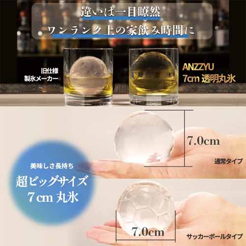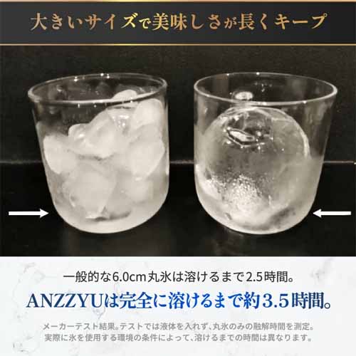 ANZZYUのアイスボールメーカーは、特許構造で不純物を下に逃がし、大きくて溶けにくい上質な透明氷を生成。直径7cmの丸氷が1回に2つ作れて、取り出しやすい設計。高級ウイスキーと合わせて贈れば特別感がアップします。