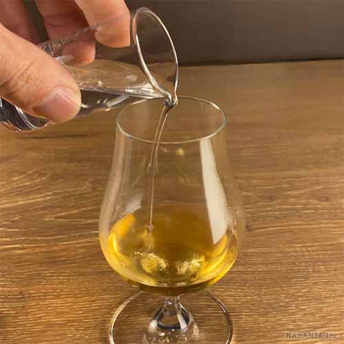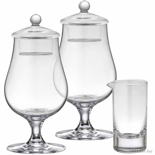 透明度の高いクリスタルガラスを使用し、約1mmのグラスの厚みで、口当たりの良さが味わえます。丸みのあるチューリップ型が香りを閉じ込め、アルコールの立ちを抑制。スニフターリッド(蓋)と加水用ミニピッチャーも付いて大満足のボリューム感です。