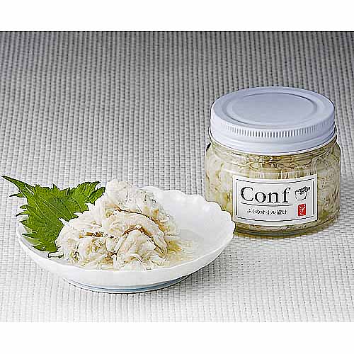 ミシュランガイド福岡・佐賀2014特別版で、二ツ星を獲得した老舗のふく料理屋「博多い津み」。お店で残ってしまった顔周りの「カマ」をオイル漬けにした、贅沢なコンフィです。5種類の味が楽しめるセットで、さまざまなメニューにアレンジ可能。