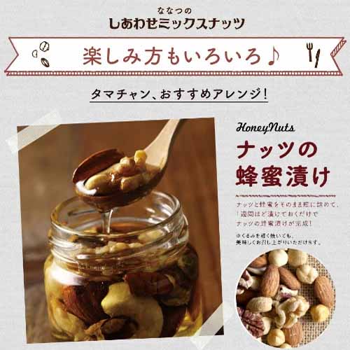 7種のナッツ(アーモンド・くるみ・カシューナッツなど)をバランスよくミックス。食塩・油不使用で、素材本来の旨みを楽しめます。1袋ずつ小分けされていて、保存や持ち運びにも便利。見た目もナチュラルで、ギフトラッピング対応あり。