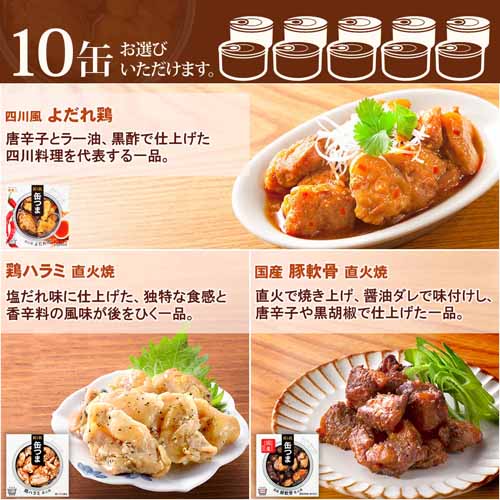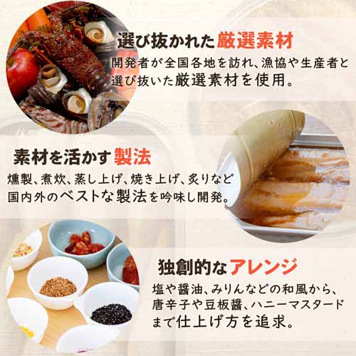 国産素材を使用し、調理済みでそのまま食べられる手軽さが魅力。牛マルチョウ・つぶ貝燻製油漬け・チーズとかきのアヒージョなど種類豊富で、23種類の中から10缶を選んでプレゼントすることができます。