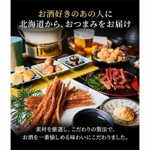 北海道の大のお酒好きが考案した「晩酌三昧シリーズ」。その中でもバラエティ豊かな海鮮珍味おつまみセットです。魚介系好きにも喜ばれるとともに、お酒の種類を問わずマッチする万能タイプで、“晩酌の主役”になるプレゼントです。