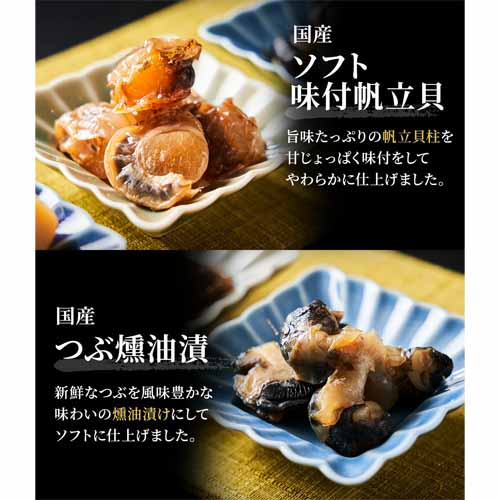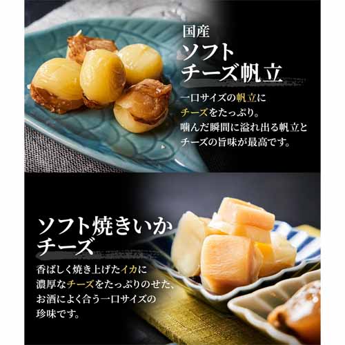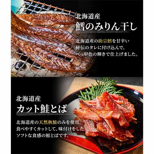 鱈のみりん干し、カット鮭とば、ソフト味付帆立貝など、北海道産を中心に厳選された国産素材を使用。いつもの晩酌にちょっぴり贅沢感を添えることができる、見た目にも豪華なバラエティセットです。