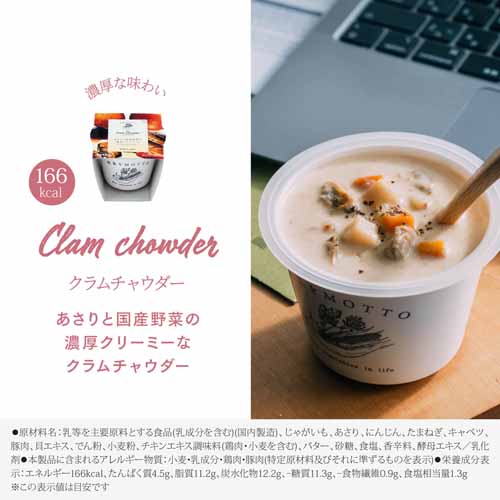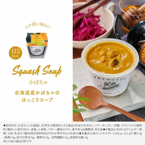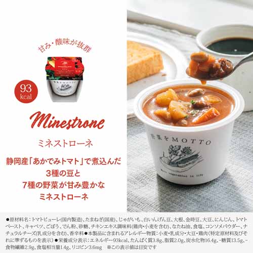 国産野菜をふんだんに使用した無添加スープ(保存料・うま味調味料・着色料が不使用)。常温保存が可能で、カップのままレンジで温めるだけで簡単。バリエーション豊富なので飽きることなく美味しくヘルシーにスープライフを楽しめます。