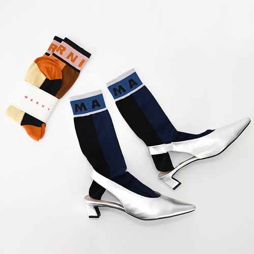 糸の色を変えて模様を入れる、カラーブロックのインターシャデザインが美しいコットン製の靴下です。ミッドカーフ丈で洗練された女性の姿を演出するとともに、マルニのブランドロゴがさり気ないハイブランド感をアピールできます。