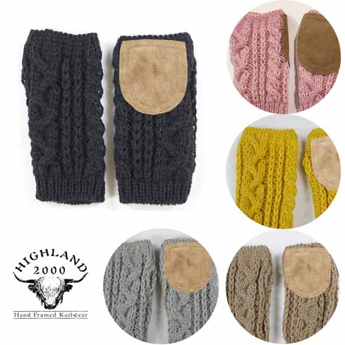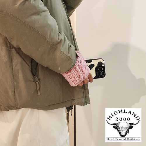 英国羊毛公社の厳しい審査により厳選された「ステッキマーク」(文字通り羊飼いの杖のマークです)を有するイギリスの老舗メーカー「ハイランド2000」が昔ながらの手編み機で製造しています。ざっくりとしたケーブル編みの大ぶりの編み模様が立体的で、単色でも存在感のあるファッションアイテムです。