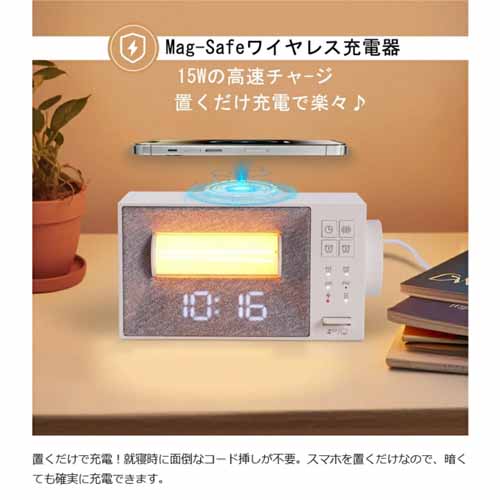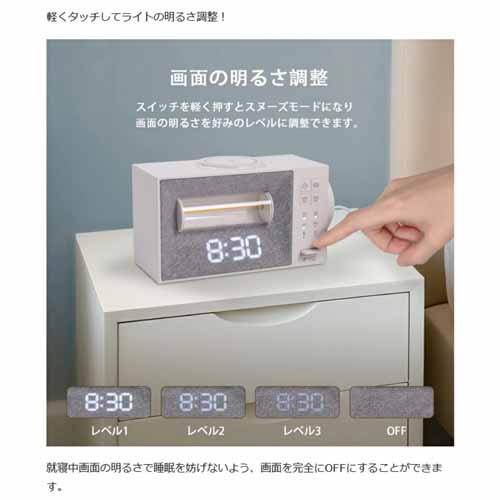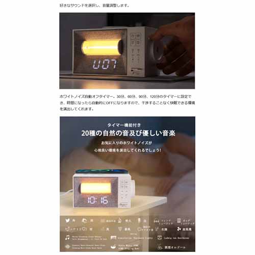 目覚まし時計・ライト・充電器が一体となったモデルで、快適に入眠タイムを過ごせる一品。ホワイトノイズ機能もあって、不眠症の人に喜ばれそうです。
