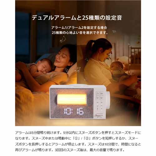光・香・音によって睡眠リズム整える時計。入眠・起床時間、ライトの強弱、サウンドを設定でき、快適な入眠と起床をサポートしてくれます。
