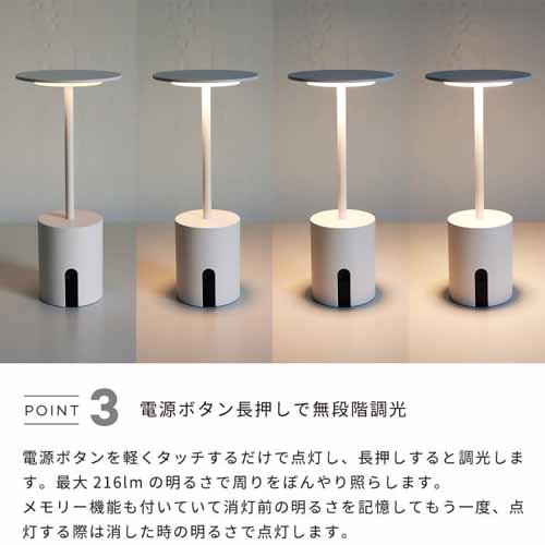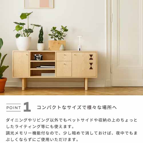 スタイリッシュなフォルムと温かな光で、寝室やリビングをリラックス空間に変えてくれる一品。タッチ操作で無段階調光できる点も魅力的です。