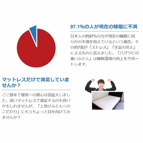 今、欧米で話題のウェイトブランケット。最初は重いと感じそうですが、数日たてば心地よく眠りについてもらえそうです。