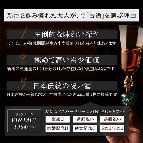 熟成による深い味わいを楽しめるヴィンテージ古酒は、日本酒通へのプレゼントとして特別感があります。普段なかなか出会えない希少性があり、記憶に残る贈り物になる点を評価して選びました。