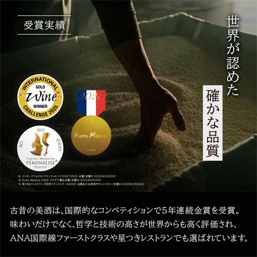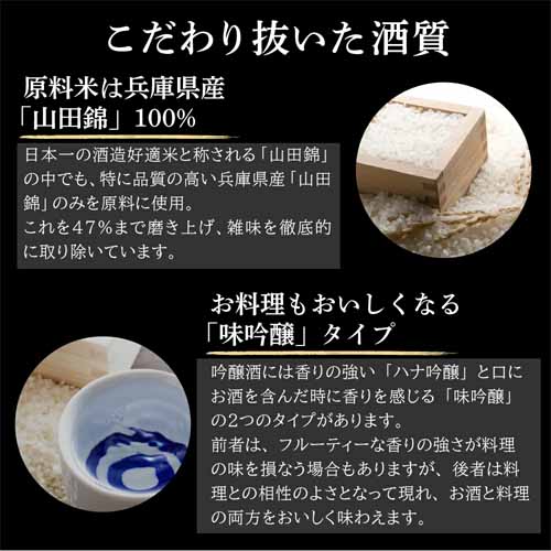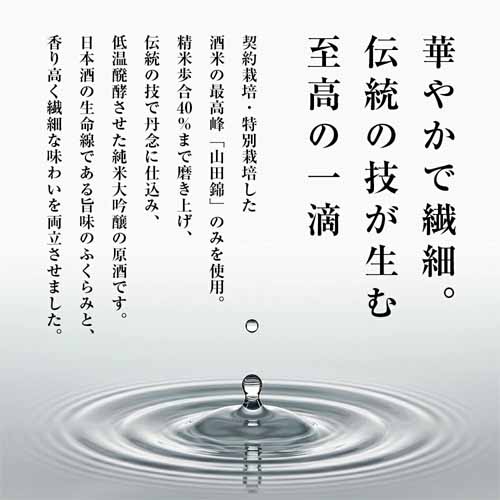 洗練されたボトルデザインとバランスの良い味わいが特徴。山田錦を100%使用した最高級の酒質を堪能できます。食事に合わせやすく、冷酒から常温まで幅広い温度帯で楽しめます。