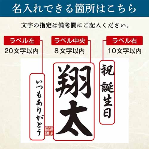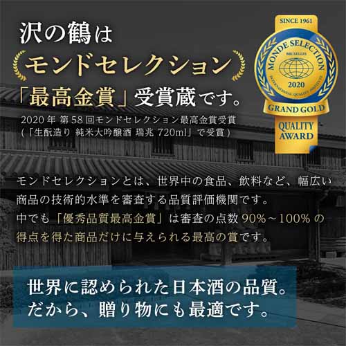単に名入れできるだけでなく、モンドセレクション最高金賞の受賞蔵である“沢の鶴”のクオリティーが魅力。こだわり抜いた酒質を堪能できる一品です。