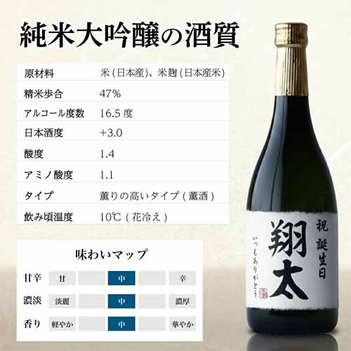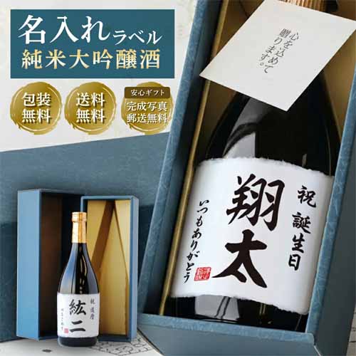 上質な純米大吟醸に名入れ加工が可能で、見た目の特別感も抜群。華やかな香りと飲みやすい味わいで幅広い層に喜ばれます。記念としてボトルを残せる点もギフト向きです。