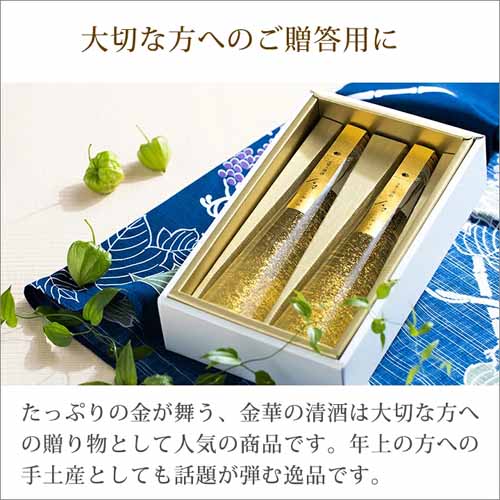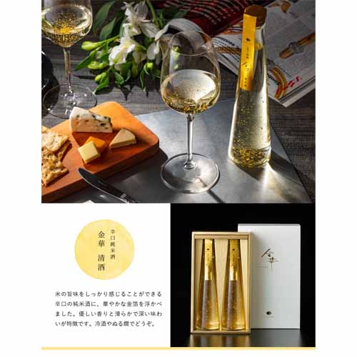 金沢金箔を使用した豪華仕様で、グラスに注いだ瞬間に特別感を演出。飲みやすい味わいで幅広い層に対応します。化粧箱入りで贈答用としての完成度も高い商品です。