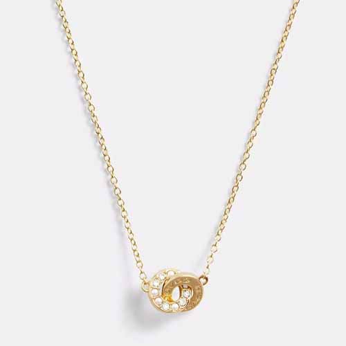 キュービックジルコニアが埋め込まれたオープンサークルのペンダントネックレス。真鍮に金メッキを施したゴールドプレートブラス仕様で、重なり合ったふたつのモチーフには、COACHのロゴがさり気なく上質感を醸しだしています。