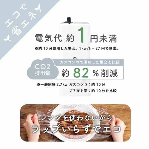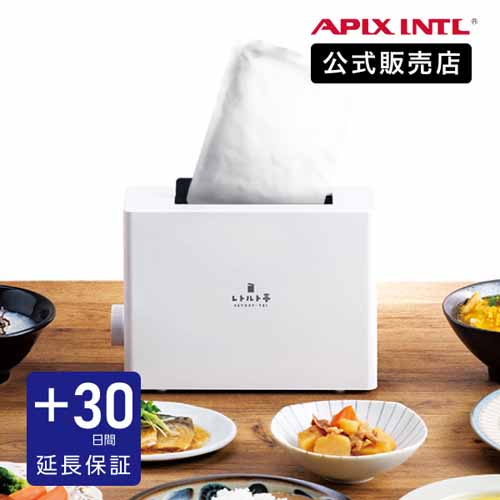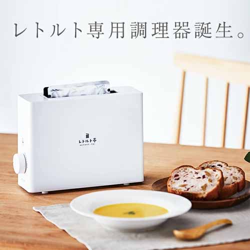トースターのような形状で、低温ヒーターによってパウチを温めるレトルト調理器。電子レンジ・お湯・ラップが不要で、レトルト食品をほったらかし調理ができる画期的でスマートな家電です。一般的な100~300gサイズのレトルト食品に対応し、約1.5kgの軽量コンパクト感が魅力的。