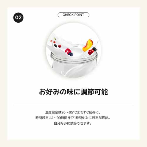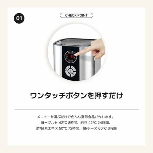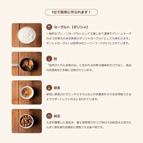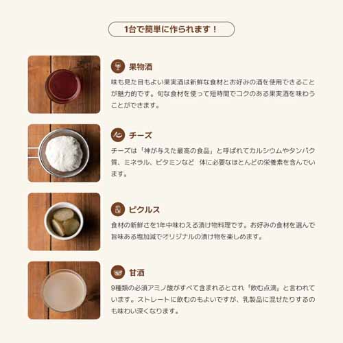 メニューを選ぶだけで、自家製のギリシャヨーグルト、カスピ海ヨーグルト、豆乳ヨーグルト、チーズ、甘酒、酵素シロップ、離乳食など、50種類の発酵食品が簡単につくれるオールインワンモデル。本格的な発酵食品をバリエーション豊富につくれます。