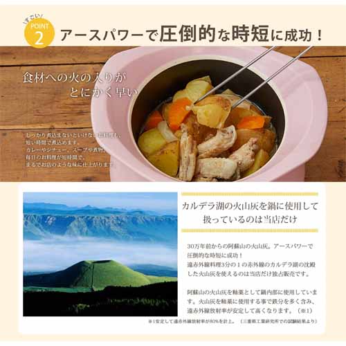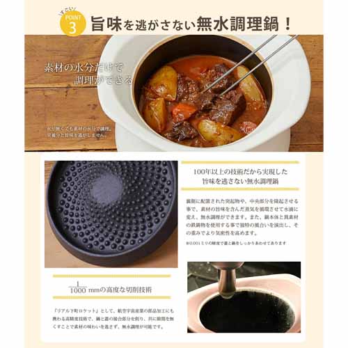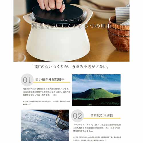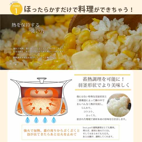 火にかける時間を大幅に短縮し、あとは蓄熱で調理してくれるため、火元から早く離れて子供の相手をしたい家庭に嬉しい仕様。ガス代が安く抑えられて経済的にも助かります。萬古焼の土鍋と確かな切削加工技術によって気密性もしっかり保たれます。