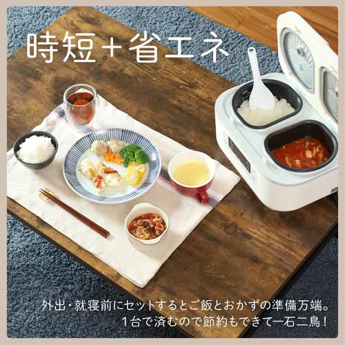 内釜が2つ付いて調理もできるダブルインナー炊飯器。材料を入れてボタンを押すだけで、左右の鍋でご飯とおかずを同時に調理することができます。カレーライスくらいなら1台で完結。蒸しプレートを付ければ同時に4品も作れます。