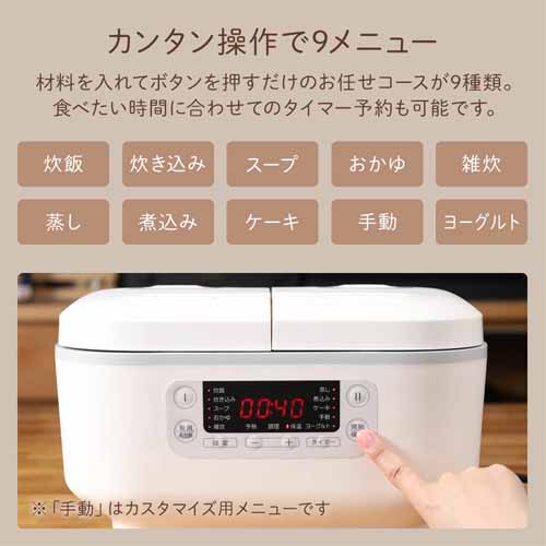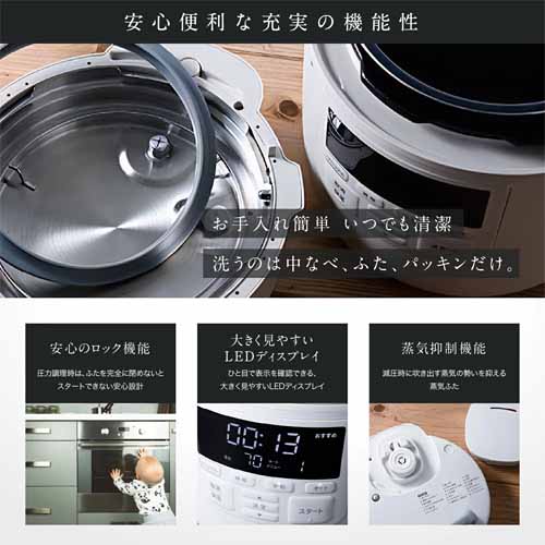 自動減圧機能で蒸気が安全に抜ける安心設計。高圧×無水調理で味がしっかり染み込み、定番のカレー・角煮・ポトフも短時間で本格的に仕上がります。予約調理・保温・スロー調理など、とにかく機能が豊富で、毎日の料理の幅が大きく広がります。