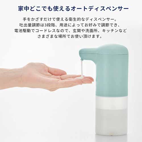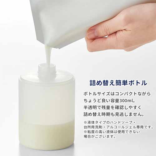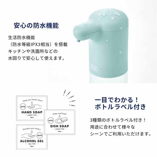 センサー感度が高く、手をかざすだけで自動で適量の液を出してくれる設計。液体タイプのハンドソープ・台所用洗剤・アルコールジェルに対応した汎用性が魅力です。防水仕様でキッチンや洗面所でも安心して使えます。