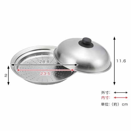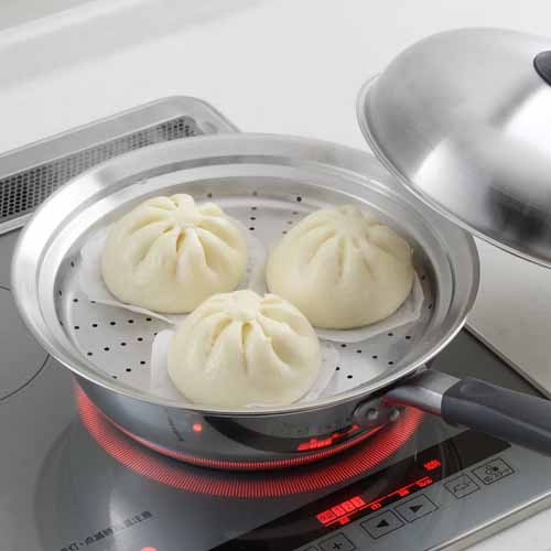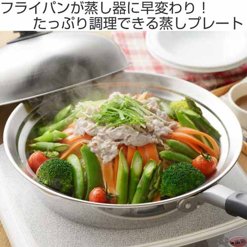24〜26cmのフライパンにセットするだけで蒸し器に変身。底面の細かい穴が蒸気を均一に通し、素材の風味を逃さず調理できる仕組みがポイントです。耐蝕性、耐久性に優れたステンレス製で、汚れやサビに強く、においも移りにくいので衛生的。竹のせいろのようにカビる心配もありません。