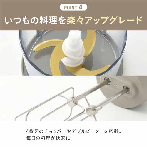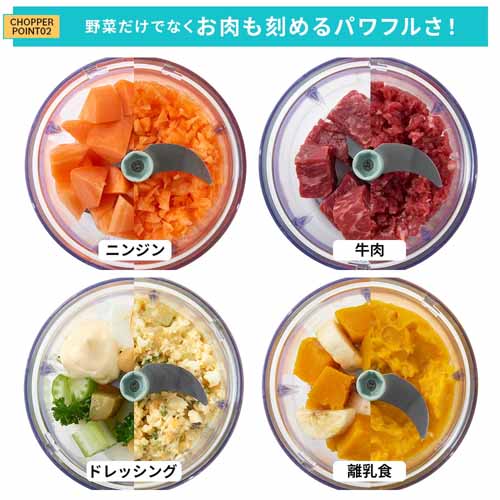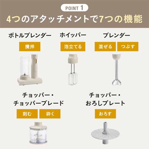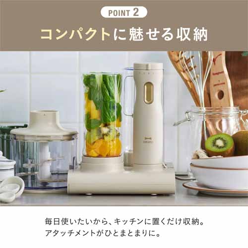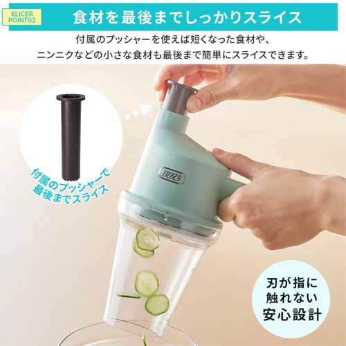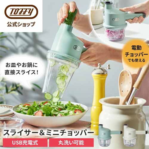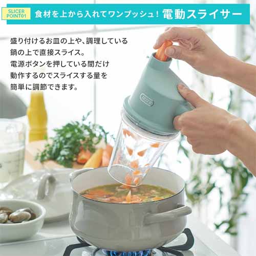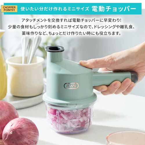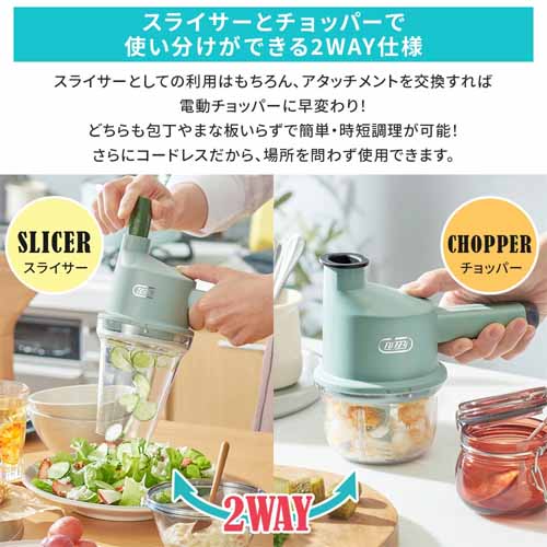 USB充電式でコードレス稼働、キッチンに置きっぱなしでも邪魔にならないコンパクトサイズが魅力。アタッチメントを付け替えるだけでスライサーからチョッパーに早変わりし、一人暮らしや薬味づくりなど少量調理にも適しています。