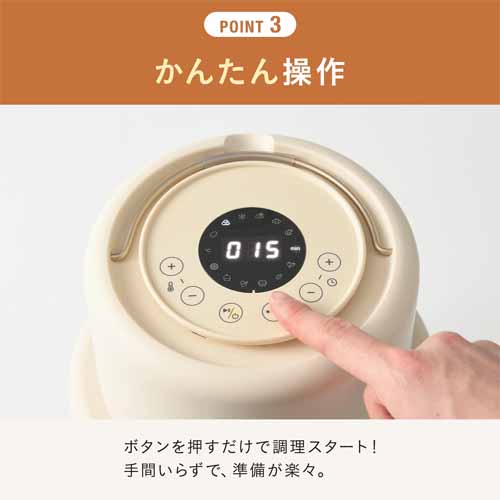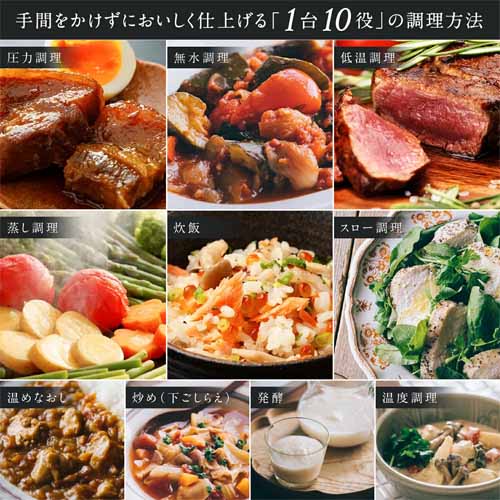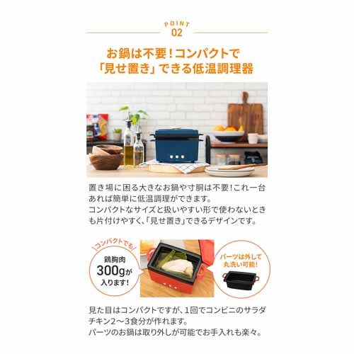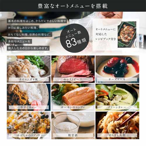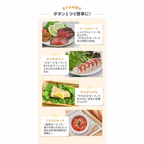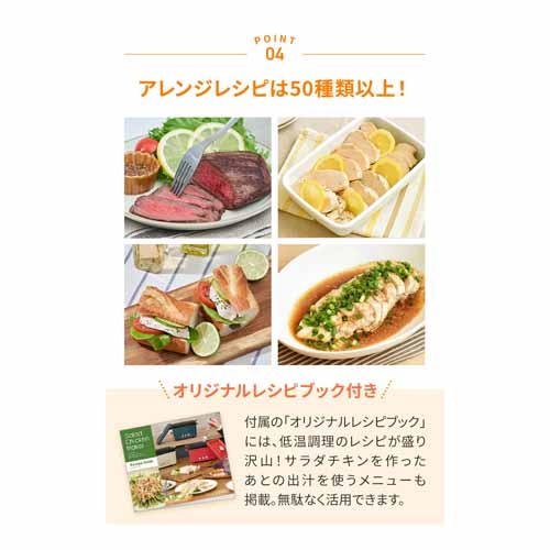 低温調理に近い温度管理で、肉がパサつかずしっとりジューシーに仕上がる構造。ムネ肉はもちろん、ローストビーフやミネストローネの調理にも対応。50種レシピつきでさまざまなバリエーションの料理に挑戦するきっかけをプレゼントすることもできます。