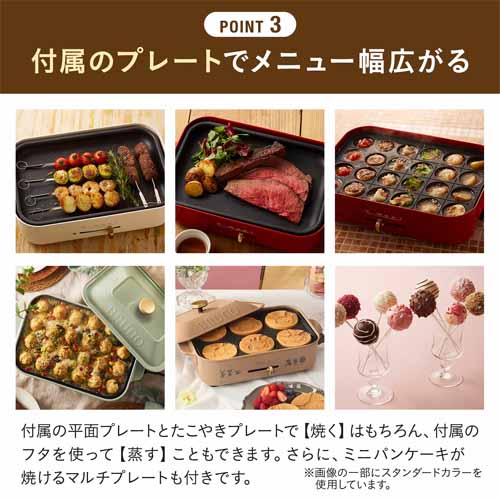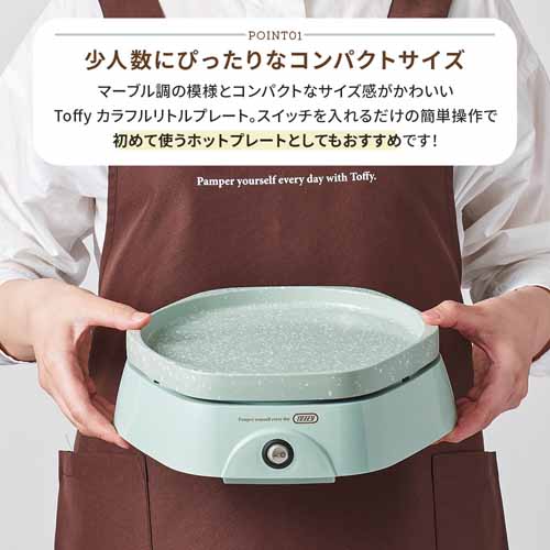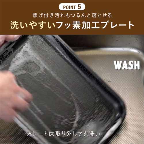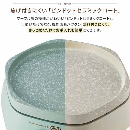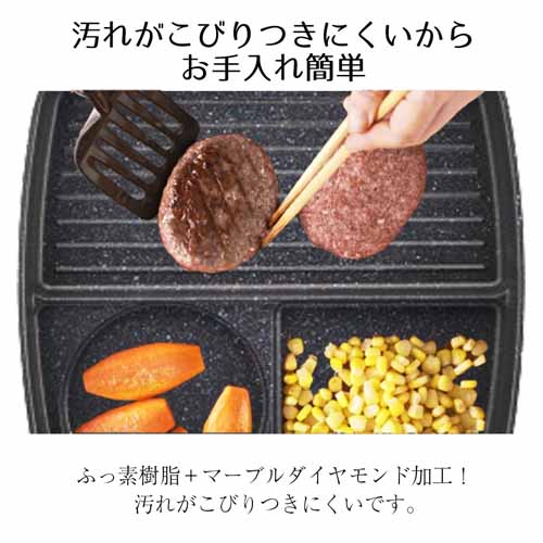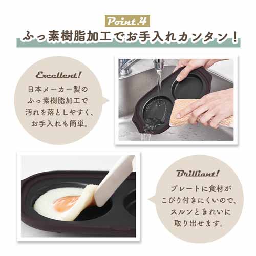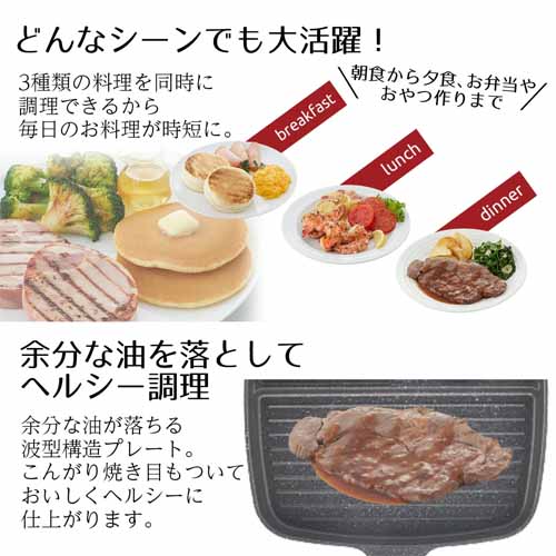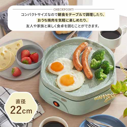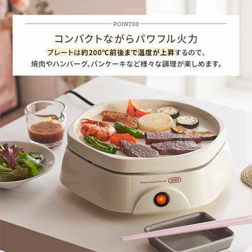 温まりが早く、均一に加熱できる高性能ヒーターを搭載。プレートは焦げ付きにくく、お手入れも簡単。コンパクト設計で置き場所を取らず、キッチンアイテムが増えがちな家庭でも使いやすいのが強みです。