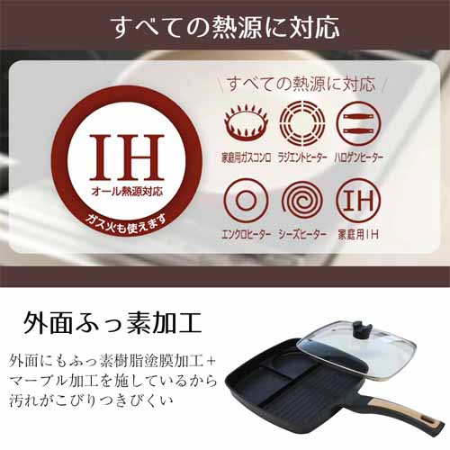 IH対応・ガス火対応で使い勝手もバツグン。焦げ付きにくいマーブルダイヤモンドコーティングで、油が少量でもきれいに仕上がります。耐摩耗性試験を100万回クリアした耐久性が圧巻で、約980gの軽量設計。ガラス蓋も付いてお得なセットです。