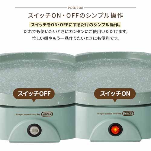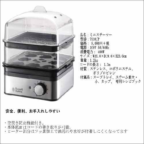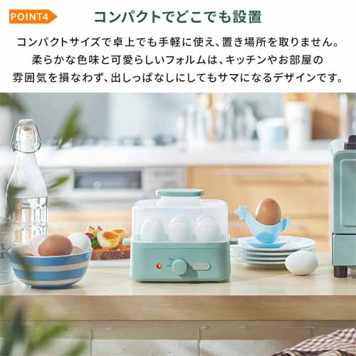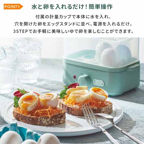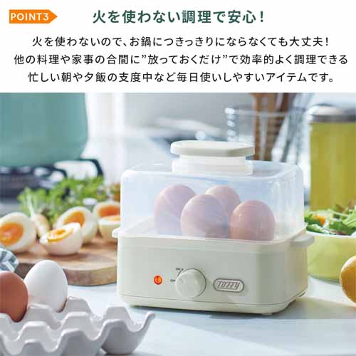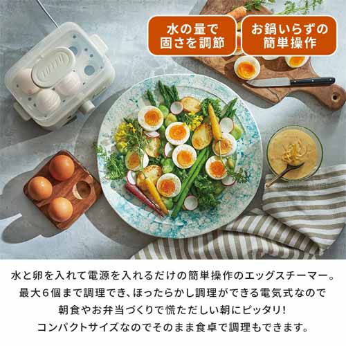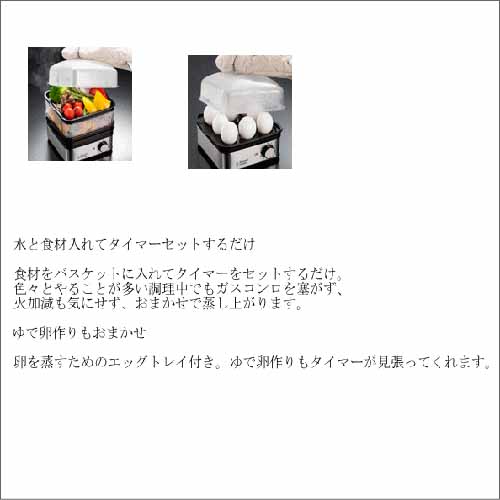 コンパクトながら2段蒸しが可能で、複数の食材を同時に調理できる効率設計。タイマー付きで放置調理でき、空焚き防止機能がついて安心です。バスケットの底面が複雑な形状をしていて、ゆで卵も8個まで同時に調理できます。