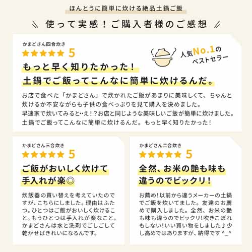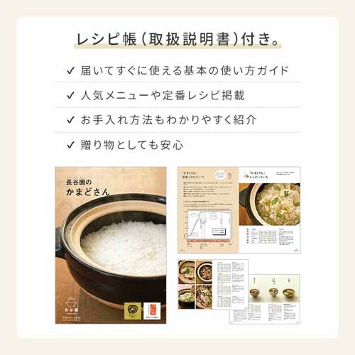 遠赤外線効果でお米の芯までふっくら炊き上げる構造。二重フタで吹きこぼれにくく、火加減なしの“ほったらかし”でも失敗しにくいのが魅力。白米三合なら中強火で約13分・蒸らし20分で炊き上がるため、時短にも役立つ便利グッズです。
