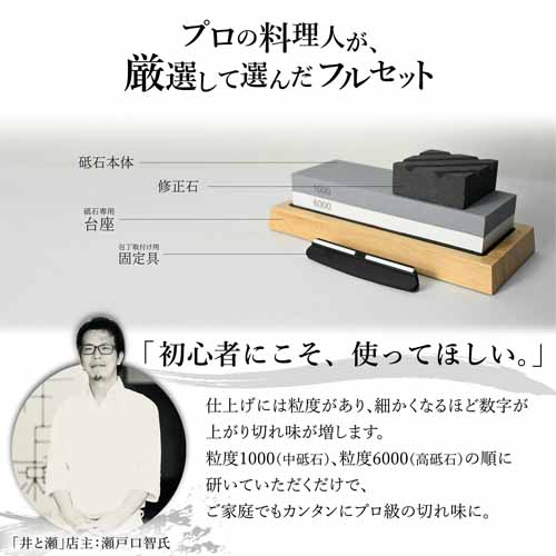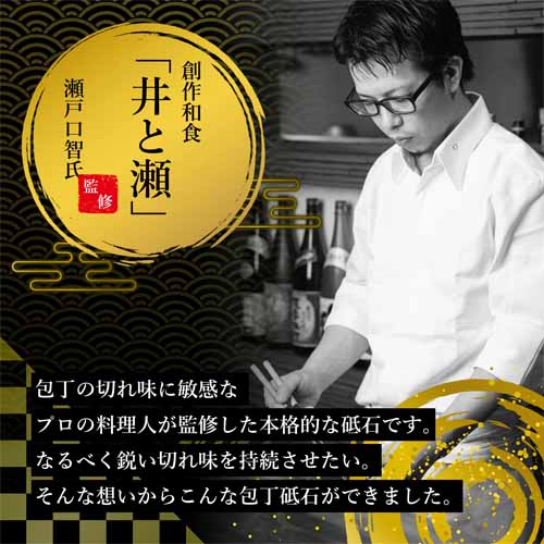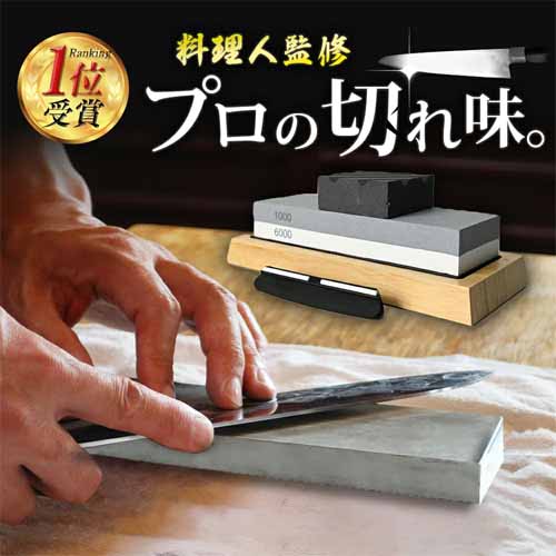 中砥石と仕上げ砥石が両面仕様になって、シチュエーションに合わせて使い分けができ、切れ味の復活から仕上げまで全工程に対応。包丁取付け用固定具や砥石専用台座もついて安定感があり、イラスト付きの研ぎ方解説書もついて初心者でも研ぎにチャレンジできます。