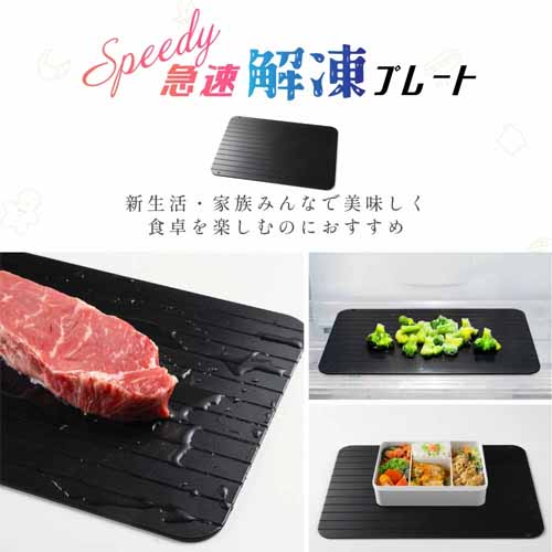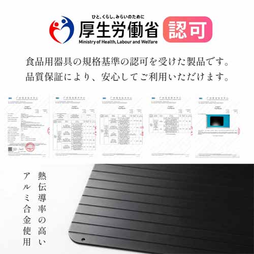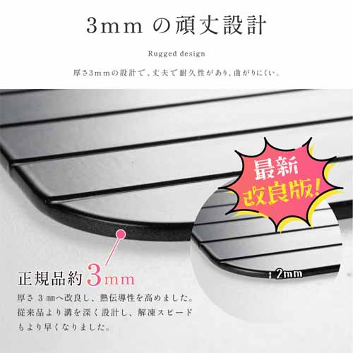 特殊アルミ合金が熱伝導を高め、常温よりも圧倒的に早く解凍できる構造。食品安全検査済みで安心して使え、ヒダ形状の溝デザインで解凍水も素早く水切りできます。熱伝導性が高いので、熱を奪うだけでなく冷却・冷凍の時間も短縮してくれる優れもの。