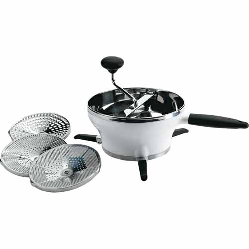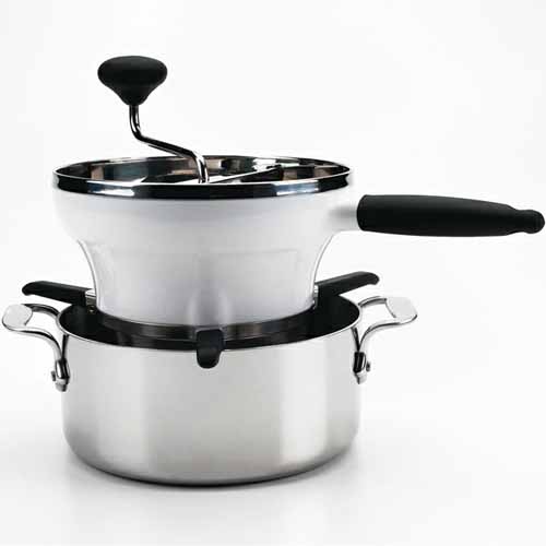 粗さの違う3種類のディスクが付属していて、用途に応じて滑らかさを調整可能。持ちやすいハンドル、しっかり固定できる脚など、OXOらしい“疲れにくいデザイン”が徹底されています。鍋やボウルの上で安定して作業できるアシ付きで、電源不要で長く使ってもらえます。
