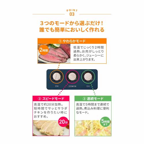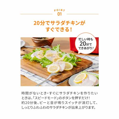 サラダチキンなら約20分で完成するスピーディーさ。やわらかモードとスピードモード、連続モードを選べるので、それぞれの好みにも対応してくれる優れものです。