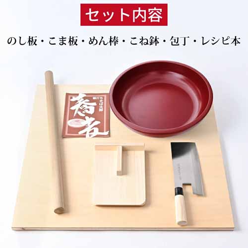 こね鉢・のし板・めん棒・こま板など必要な道具が一通り揃った充実セット。すべて日本製で品質が高く、初めてでも挑戦しやすいレシピ本が付いています。長く使える丈夫な作りで、本格料理を支える一式です。