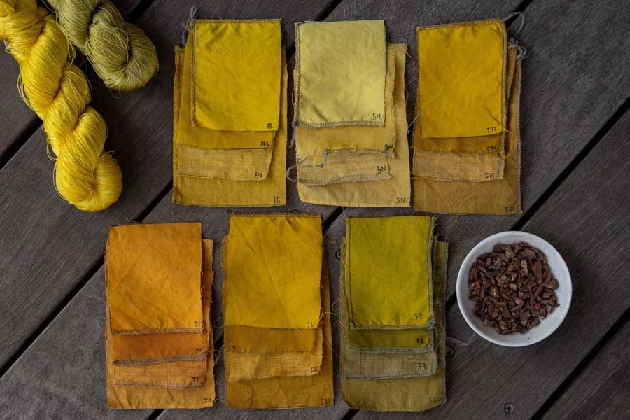 季節ごとに移ろう自然の表情をそのまま映し取った色は、まさに一期一会の美しさ。さらに、鉄や銅を用いた「媒染」によって、ひとつの植物からも多様な色合いが引き出されます。