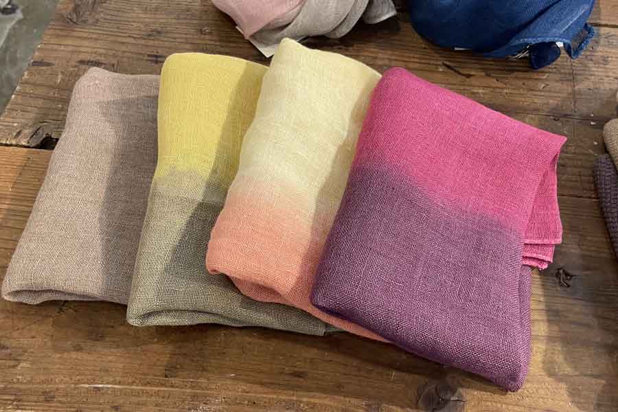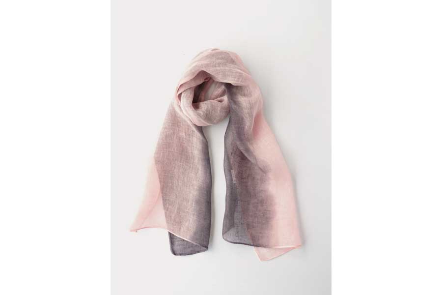 1万円前後で贈れる中でも、しっかりと特別感を演出できるのがインドリネンスカーフ。山桃、藍、紫香、茜、桜などさまざまな素材で染められていて、「段染め」の技法を用いることで、2色に染め分けています。