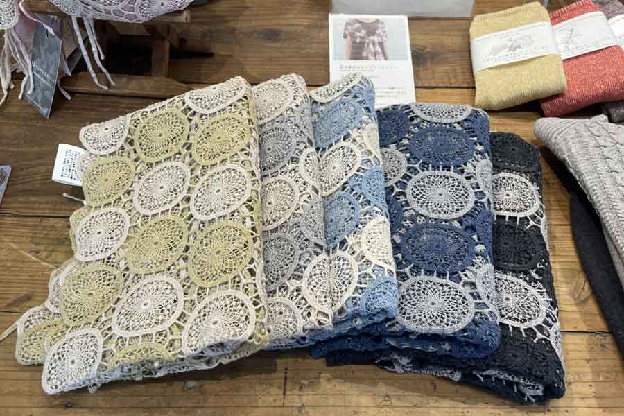 少し華やかさや印象に残る贈り物を選びたいのなら、レース編みのエンブロイマフラーがおすすめ。草木染めのやさしい色合いの糸で繊細に編み上げ、シンプルな装いにも自然と個性を添えてくれます。