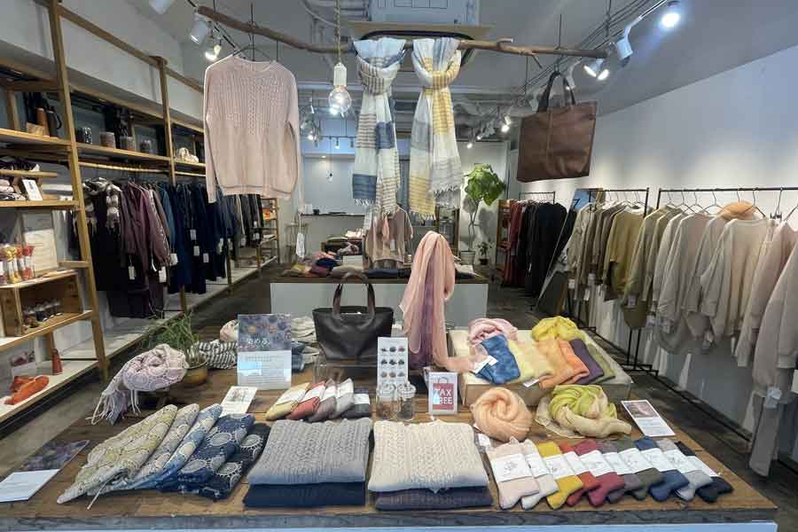 白を基調とした空間に、桜や藍、柘榴から生まれた草木染めのアイテムが並び、その一つひとつが静かに呼吸しているような存在感を放っています。什器や棚の多くは手作りで、木や古道具の温もりが、色の美しさをより一層引き立てています。